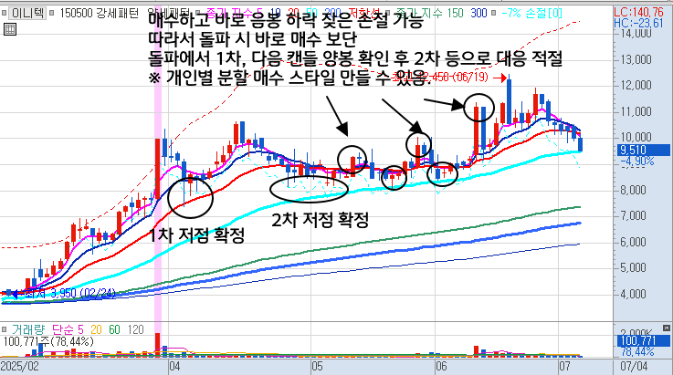 - 만약 종목에 대한 어느 정도의 확신이 있다면 두 번째 저점이 확정되는 반등자리에서 미리 선취매하는 것도 방법이다.