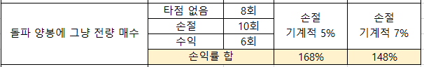 - 이때 손절을 기계적으로 5%에서 실행했다고 가정했을 때 적용한다면 총 손익률 합은 168%