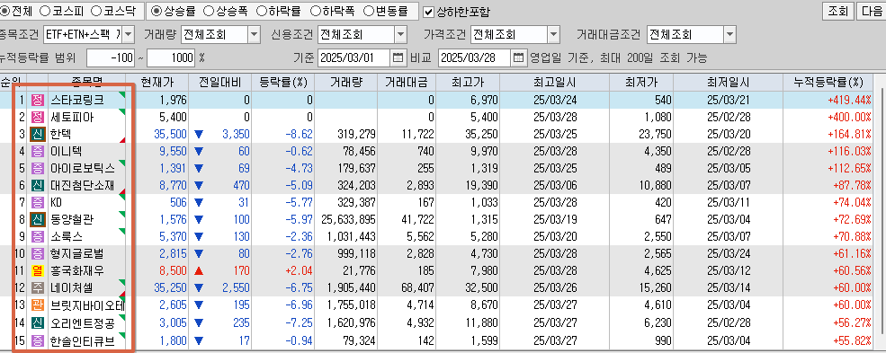 - 3월달 등락률 상위 종목은 이니텍, 아이로보틱스, KD, 동양철관, 소룩스, 헝지글로벌입니다.