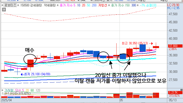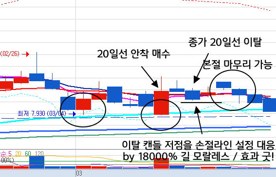 - 만약 20일선 이탈로 손절처리한 종목이 다시 20일선을 돌파하면 상승하는 것을 경험하면 다음에는 20일선 이탈에도 손절하지 않고 버티는 전략을 사용할 수 있는데,