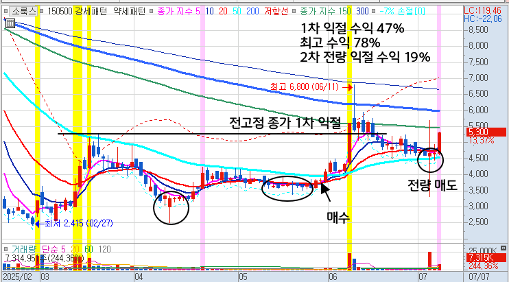 - 소록스의 경우 1차 전고점 돌파 종가 캔들에서 1차 익절하여 47%의 수익을 챙길 수 있었고,