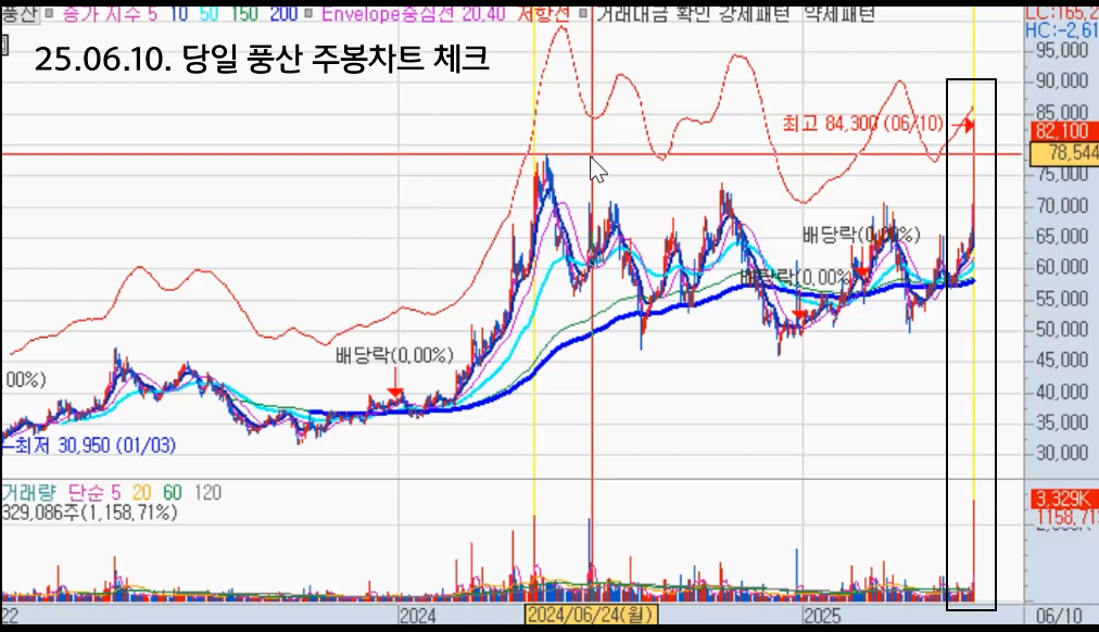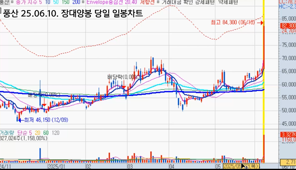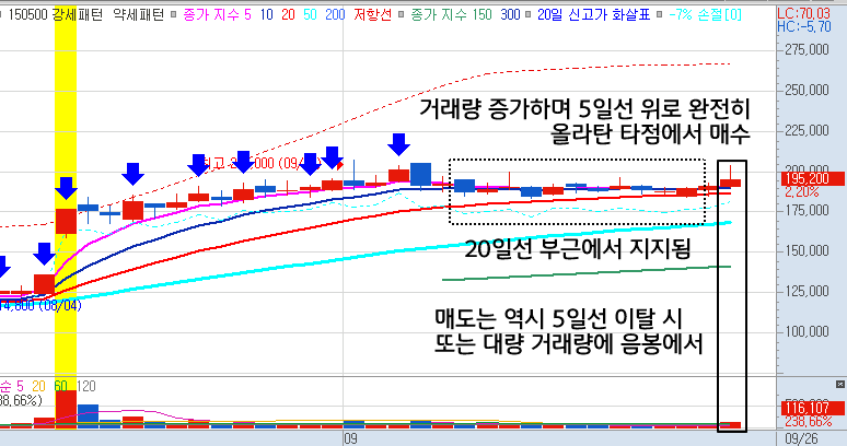 - 여기에 패턴을 보니까 20일선 돌파도 강하게 상한가로 돌파한 다음, 조정을 받으면서 다시 20일선에 닿고 거래량이 바닥권일 때 분할로 매수했지요.