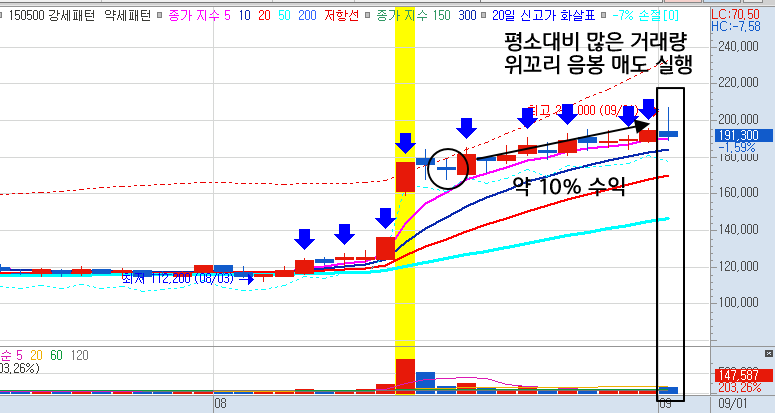 - 대량 거래량이 터진다 싶으면 바로 매도합니다.